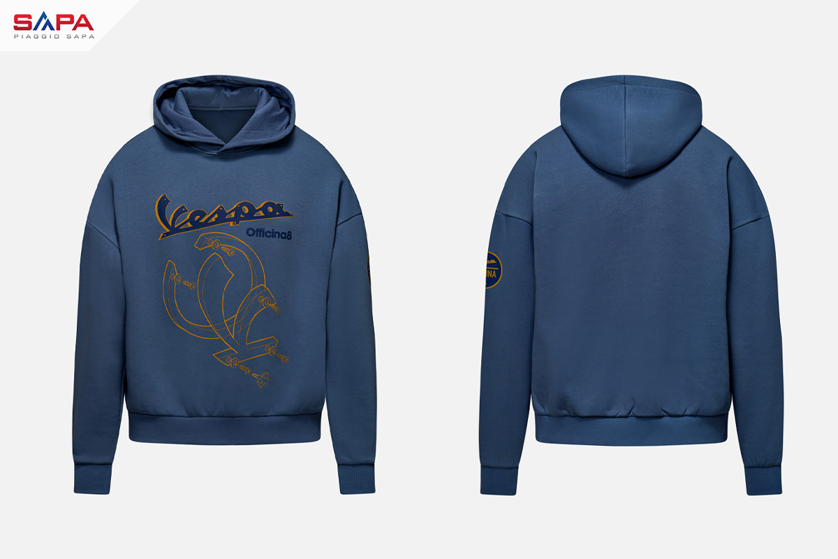 Điều làm nên sự khác biệt của áo hoodie này chính là họa tiết Officina 8 theo phong cách công nghiệp được in tinh tế ở ngực và tay áo. Các chi tiết này không chỉ tôn vinh di sản của Vespa mà còn tạo nên một vẻ ngoài độc đáo, cá tính và không thể nhầm lẫn.
