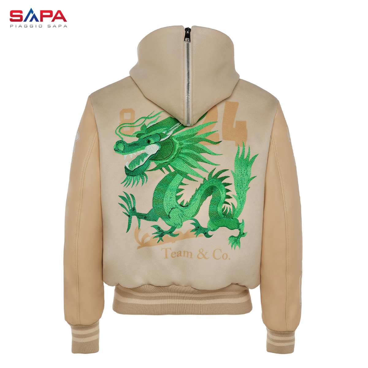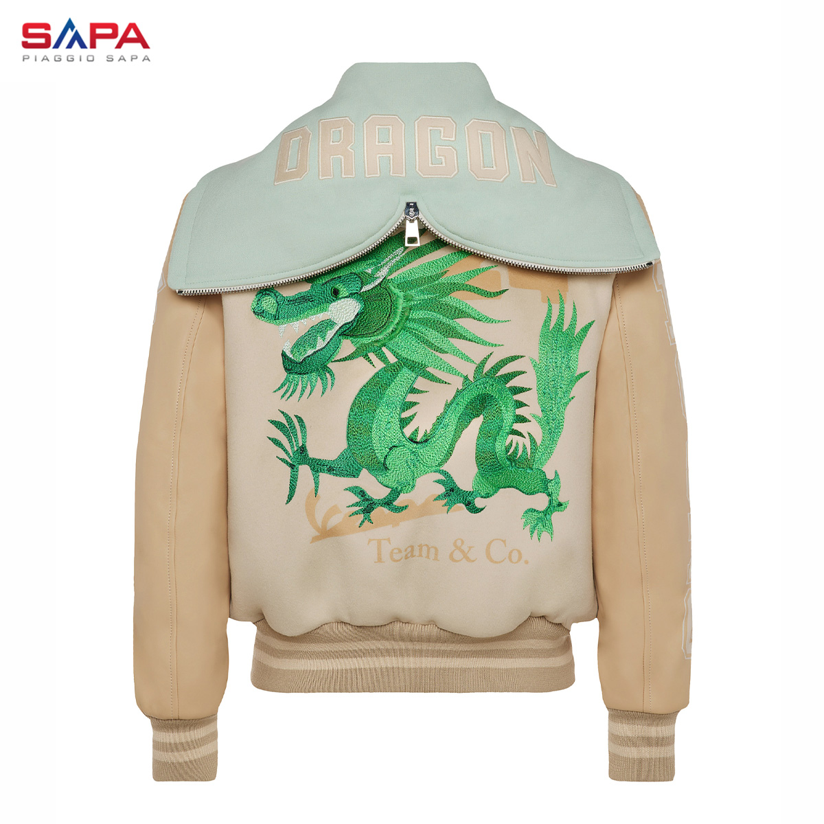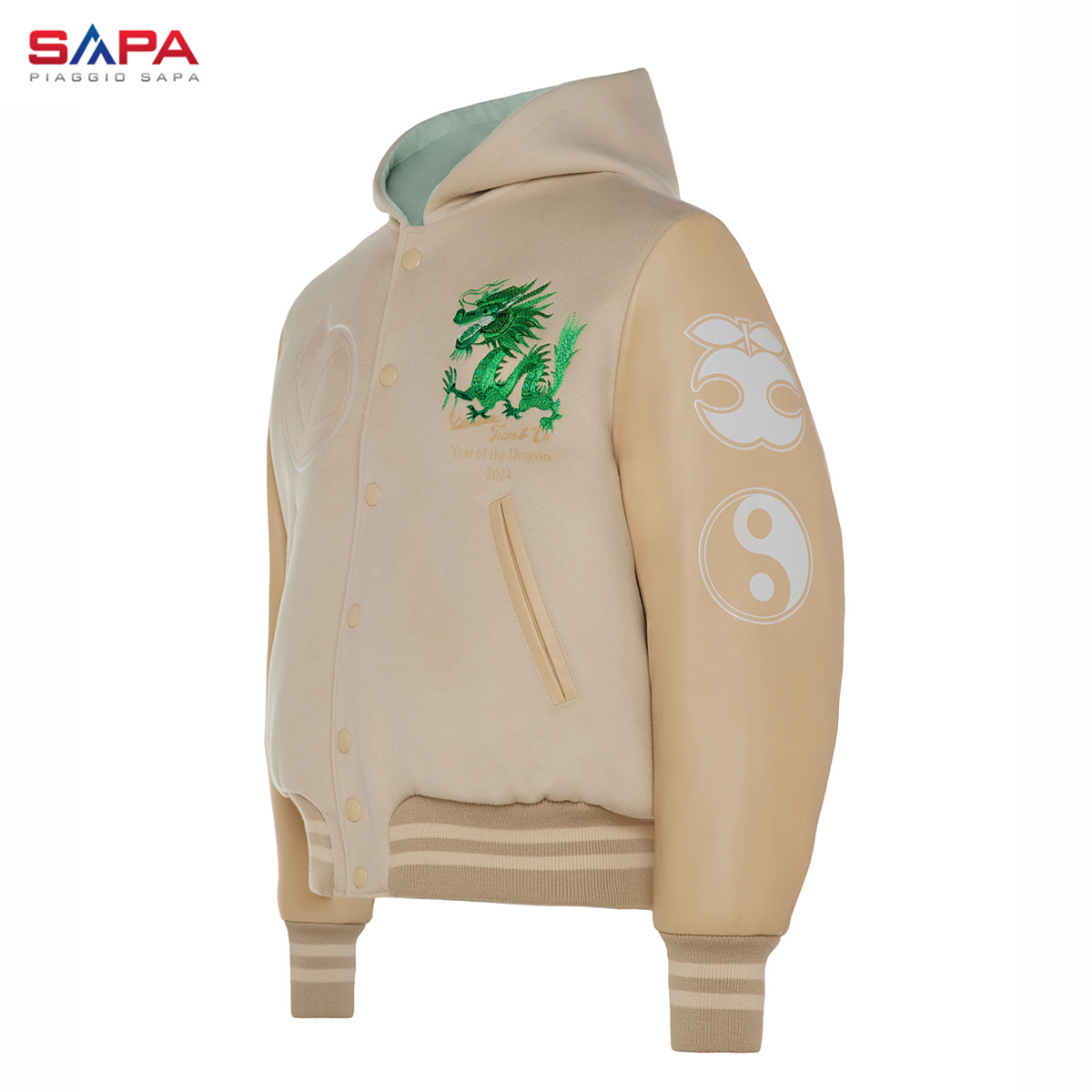 Lấy cảm hứng từ hình tượng rồng mạnh mẽ và huyền bí, chiếc áo khoác Dragon Varsity mang đậm phong cách Ý sang trọng và tinh tế. Thân áo được làm từ chất liệu len gân màu be nhạt, kết hợp với tay áo da cừu (da Nappa) mềm mại, tạo nên vẻ ngoài vừa cổ điển, vừa hiện đại. Điểm nhấn đặc biệt của chiếc áo là họa tiết rồng màu xanh lục bảo được thêu nổi một cách tỉ mỉ trên ngực trái và mặt lưng sau, thể hiện sự quyền lực và may mắn. Biểu tượng chữ "V" của Vespa được thêu trên ngực phải, khẳng định thương hiệu và đẳng cấp của người mặc.