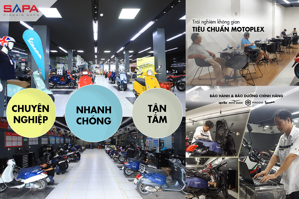 Đây là trung tâm bảo hành, bảo dưỡng chính hãng 4 thương hiệu xe: Vespa, Piaggio, và đặc biệt là nơi bảo dưỡng, bảo hành xe Aprilia, Moto Guzzi chính hãng duy nhất tại Tp.HCM. Được ủy quyền chính thức từ Piaggio Việt Nam.