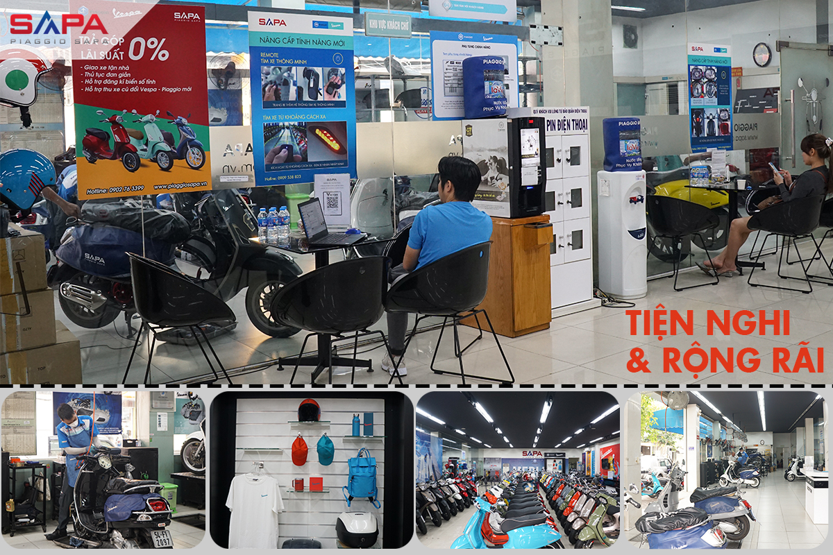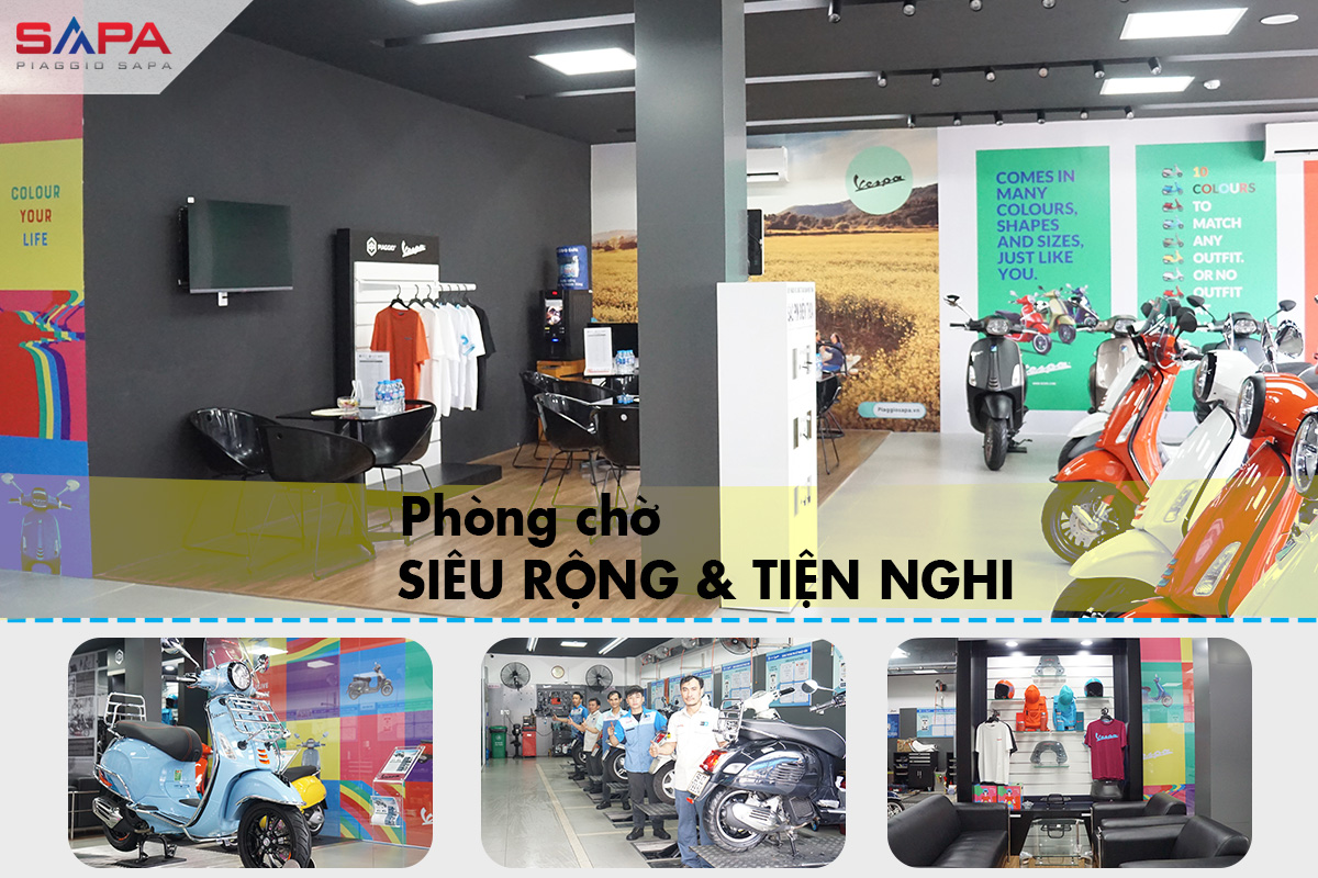 Vị trí thuận tiện và không gian cực kỳ rộng theo đúng tiêu chuẩn của Piaggio. Khu vực phòng chờ yên tĩnh và thoáng mát, rộng rãi, có đủ tiện nghi phục vụ. Mọi khách hàng đến với trung tâm Vespa Sapa Kinh Dương Vương được phục vụ cafe pha máy miễn phí. Với khách hàng mua xe, đây là nơi có kho xe lớn, đầy đủ các phiên bản xe Vespa, Piaggio mới nhất và phân phối chính hãng.