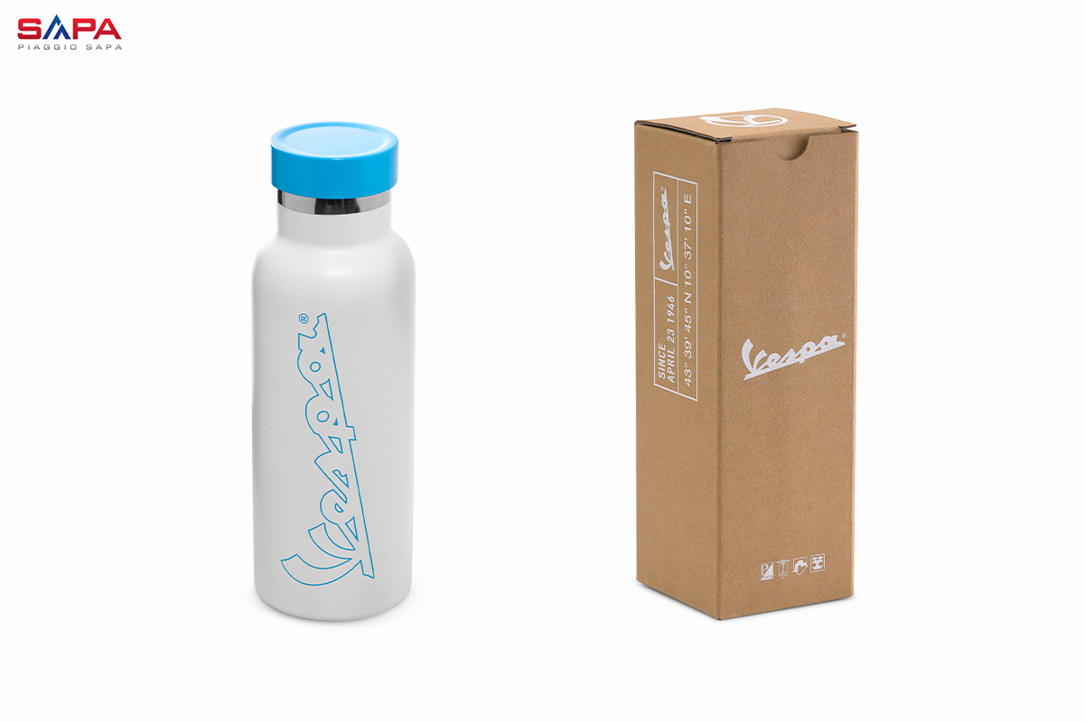 Thiết kế màu trắng tinh khiết kết hợp cùng logo Vespa cổ điển được in nổi bật, chiếc bình tạo cảm giác sạch sẽ, trang nhã nhưng vẫn nổi bật cá tính của người sử dụng. Đó là sự giao thoa hoàn hảo giữa tính tiện dụng và phong cách sống đậm chất Ý.