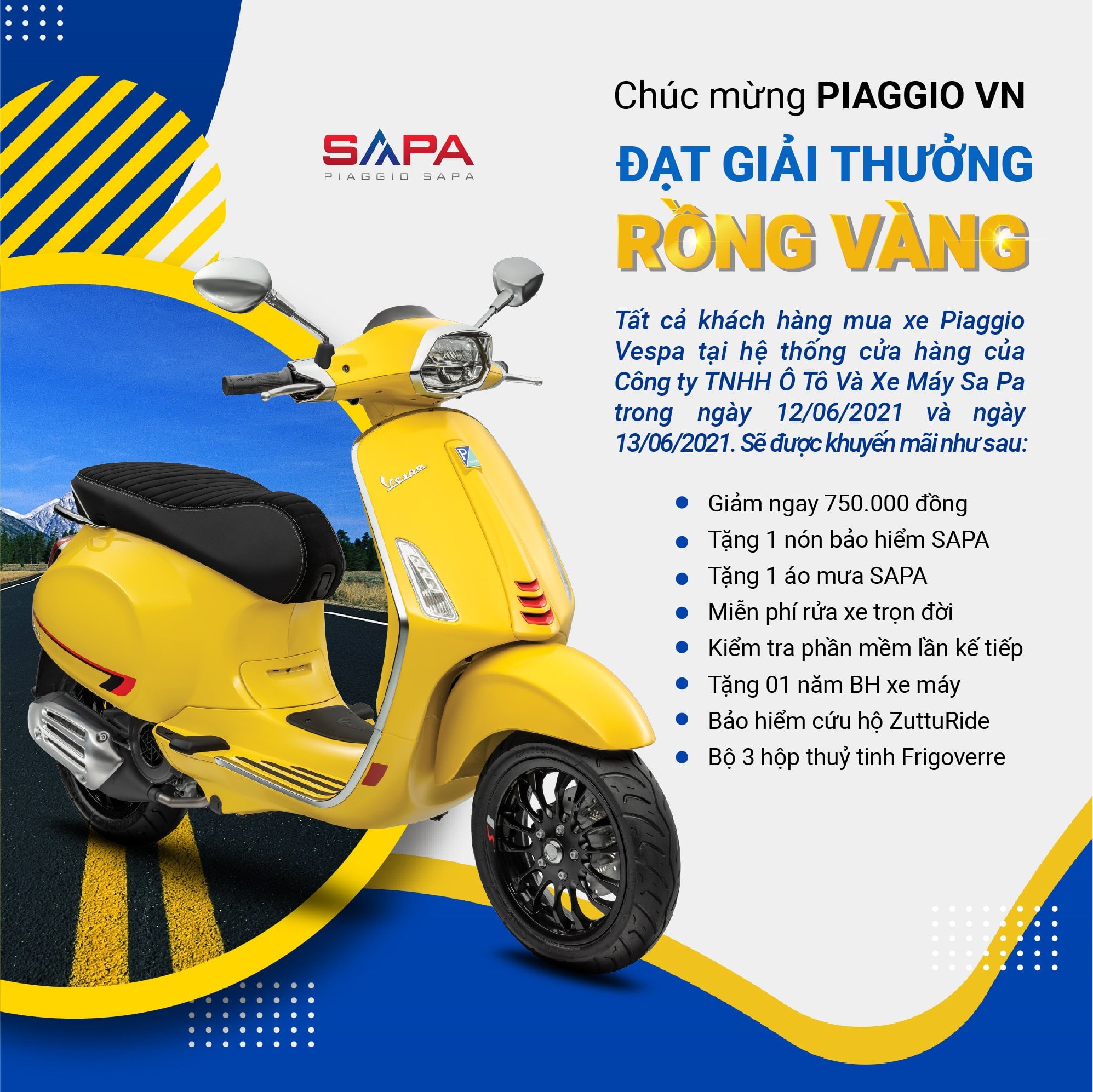 Cùng ăn mừng cùng Piaggio Việt Nam, 𝐏𝐈𝐀𝐆𝐆𝐈𝐎 𝐒𝐀𝐏𝐀 dành tặng tất cả khách hàng mua xe #Piaggio hoặc #Vespa tại hệ thống cửa hàng của 𝐂ô𝐧𝐠 𝐭𝐲 𝐓𝐍𝐇𝐇 Ô 𝐓ô 𝐕à 𝐗𝐞 𝐌á𝐲 𝐒𝐚𝐏𝐚 trong ngày 𝟏𝟐/𝟎𝟔/𝟐𝟎𝟐𝟏 và ngày 𝟏𝟑/𝟎𝟔/𝟐𝟎𝟐𝟏 các #ưu_đãi sau: