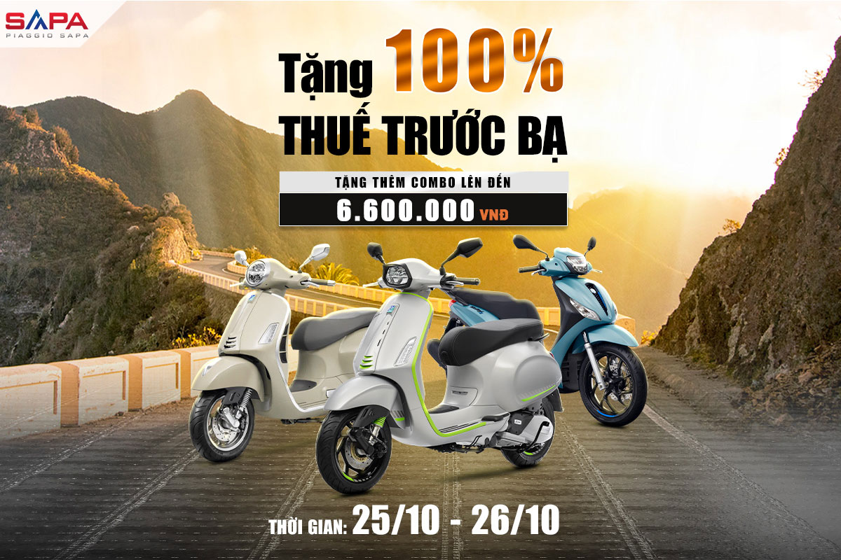 Duy nhất 2 ngày 25.10 và 26.10 với một đặc quyền ưu đãi cực lớn, đặc biệt là dành cho Vespa Sprint (125/150cc) 2025, Vespa Primavera 2025 hoặc Piaggio Liberty 2025 tại các hệ thống Showroom Vespa Sapa. TẶNG 100% THUẾ TRƯỚC BẠ, cùng hàng Combo quà tặng chính hãng trị giá 2Tr940 và ĐẶC BIỆT tặng THÊM BỘ MIA(Kết nối Smartphone) trị giá 3Tr200 cho xe Sprint/Primavera 2025 và bộ MIA trị giá 2Tr800 cho xe Liberty 2025.
