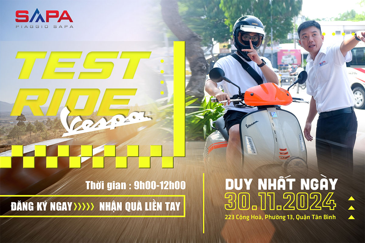 Sự kiện Test Ride dành cho mọi khách hàng trước khi quyết định mua xe Vespa, Piaggio, Aprilia. Trải nghiệm lái thử các dòng xe thế hệ mới nhất Vespa GTV 300HPE, Vespa Sprint 125, Primavera 125, Piaggio Medley, Aprilia SRGT200 tại: