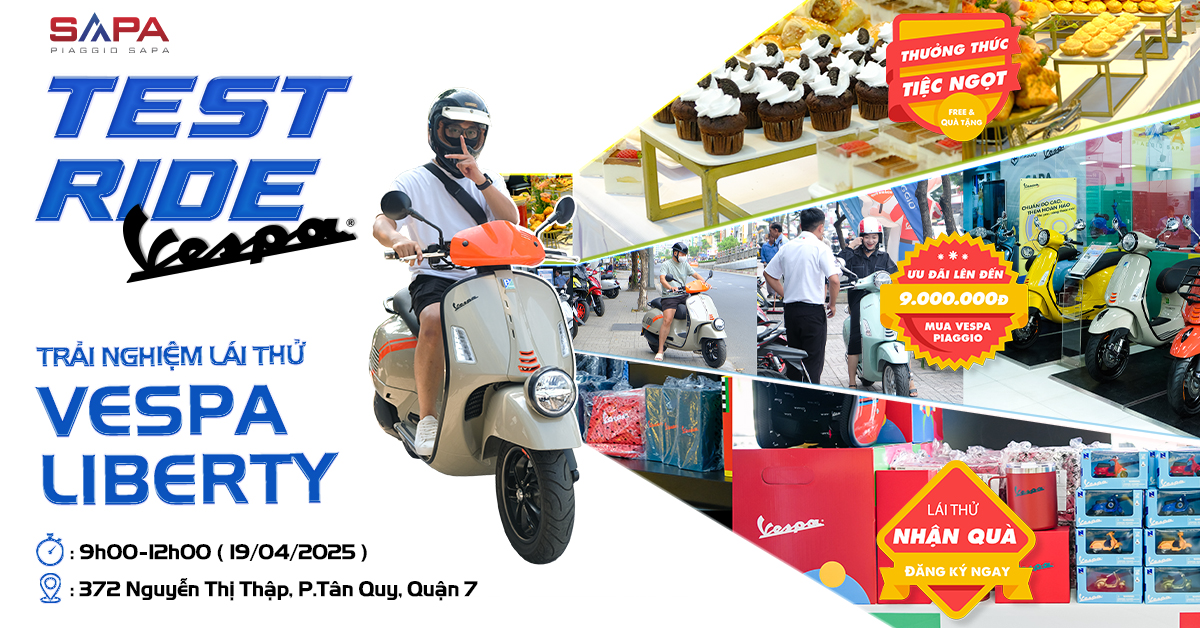 Cùng trải nghiệm lái thử các dòng xe mới nhất, đăng ký tham dự sự kiện Test Ride dành cho mọi khách hàng trước khi quyết định mua xe Vespa, Liberty 2025, Piaggio Medley, Aprilia SRGT200. Hãy đăng ký ngay để trải nghiệm lái thử các dòng xe: Vespa GTV 300HPE, Vespa Sprint 125, Liberty 2025, Piaggio Medley, Aprilia SRGT200 tại: