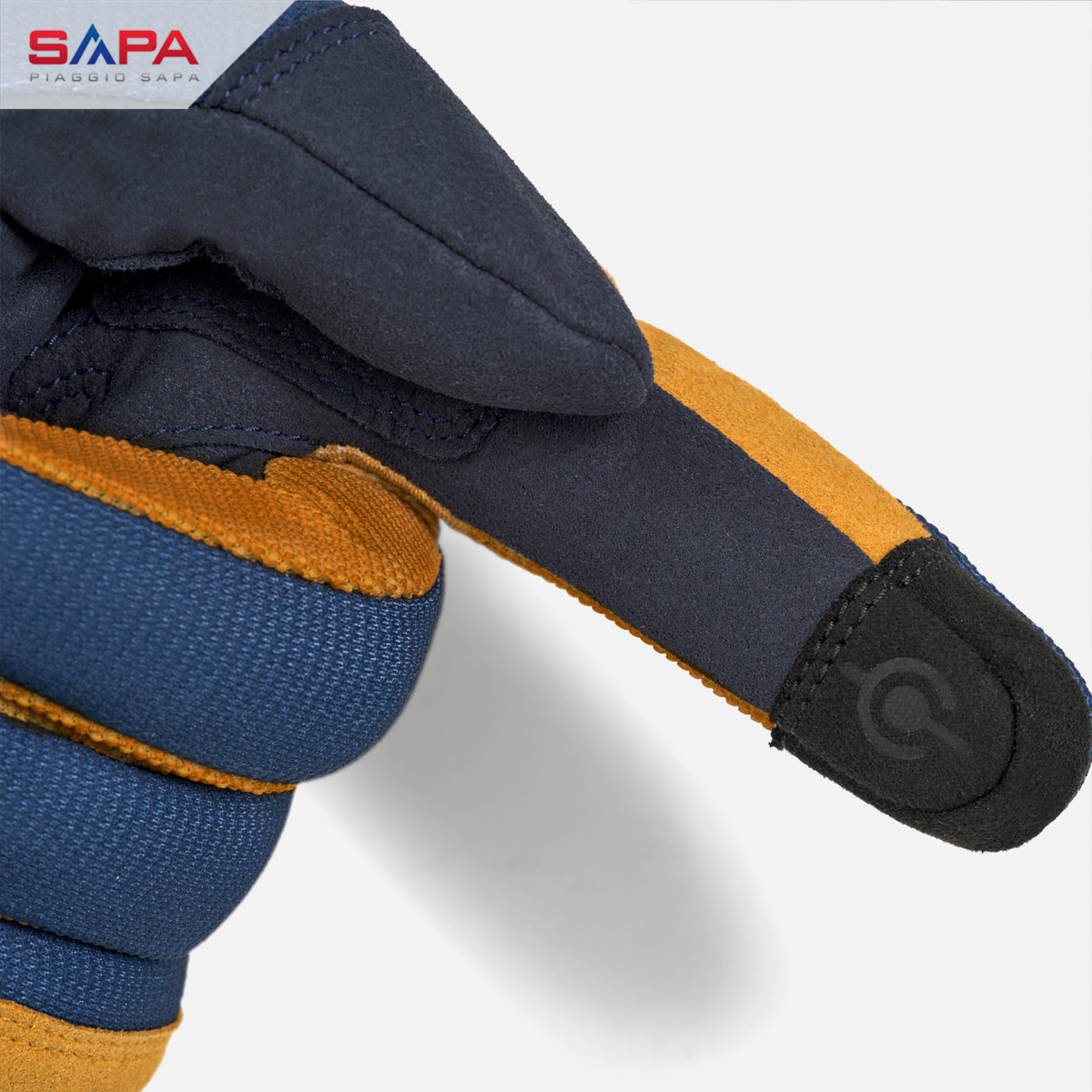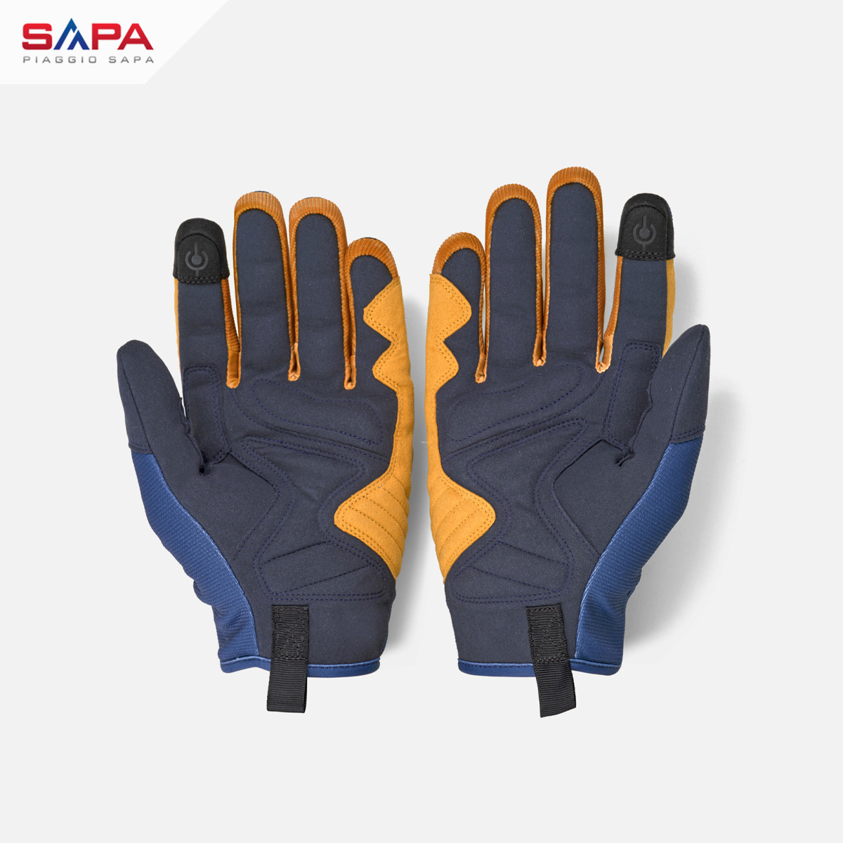 Găng tay có màu xanh công nghiệp đặc trưng (Blu Officina 8), một sắc thái độc đáo và thời thượng. Đầu ngón tay được thiết kế đặc biệt, cho phép bạn thao tác trên màn hình cảm ứng của điện thoại hoặc thiết bị GPS mà không cần tháo găng tay, mang lại sự tiện lợi tối đa. Dây đeo Velcro chắc chắn ở cổ tay giúp găng tay luôn ôm sát, không bị tuột, đồng thời dễ dàng điều chỉnh và sử dụng.