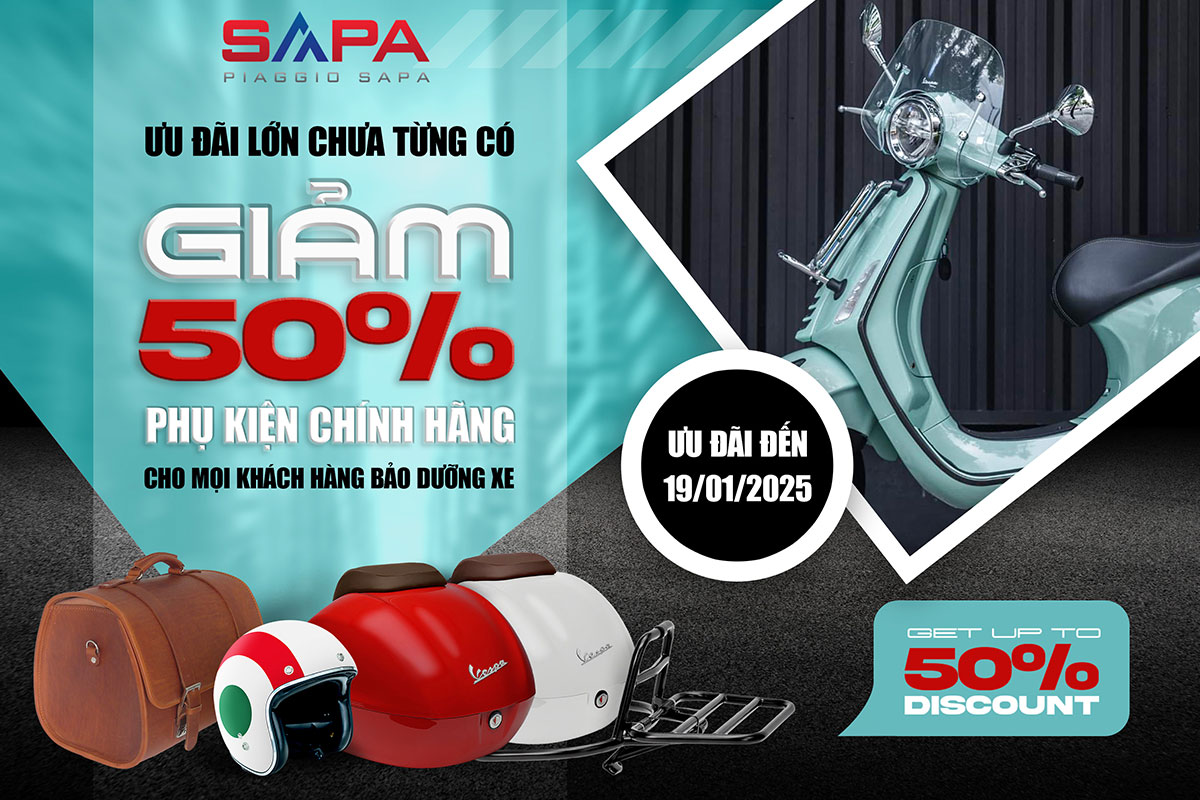 👉 Vespa Sapa ưu đãi 𝐆𝐈𝐀̉𝐌 𝐍𝐆𝐀𝐘 𝟓𝟎% giá trị đơn hàng mua phụ kiện cho mọi khách hàng mua phụ kiện khi đến bảo dưỡng tại các hệ thống Vespa Sapa.