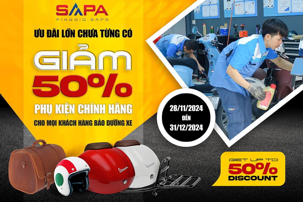 👉 Vespa Sapa ưu đãi 𝐆𝐈𝐀̉𝐌 𝐍𝐆𝐀𝐘 𝟓𝟎% giá trị đơn hàng mua phụ kiện cho mọi khách hàng mua phụ kiện khi đến bảo dưỡng tại các hệ thống Vespa Sapa.