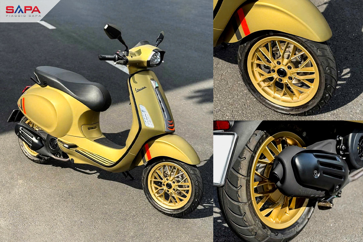 Mâm được sơn màu vàng đồng ánh kim mang đến vẻ đẹp sang trọng, cá tính và đậm chất thời trang Ý, giúp chiếc xe nổi bật trên mọi hành trình.