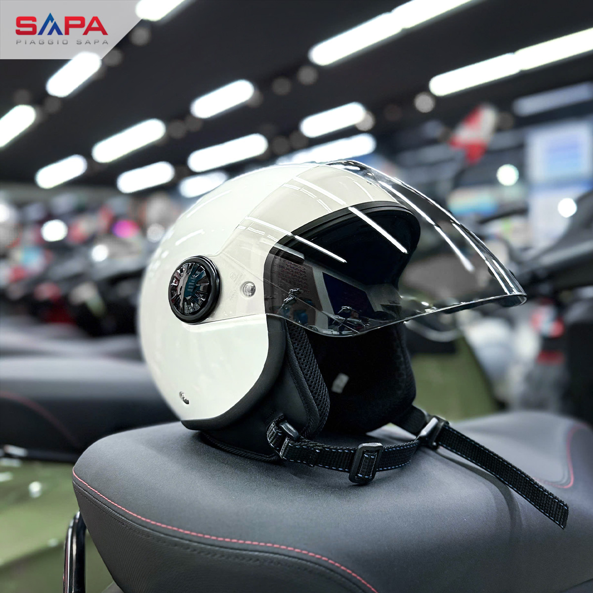 Mũ bảo hiểm Piaggio màu trắng với thiết kế tinh tế và chất liệu bền bỉ, đây là lựa chọn hoàn hảo cho người yêu thích sự an toàn, thời trang.