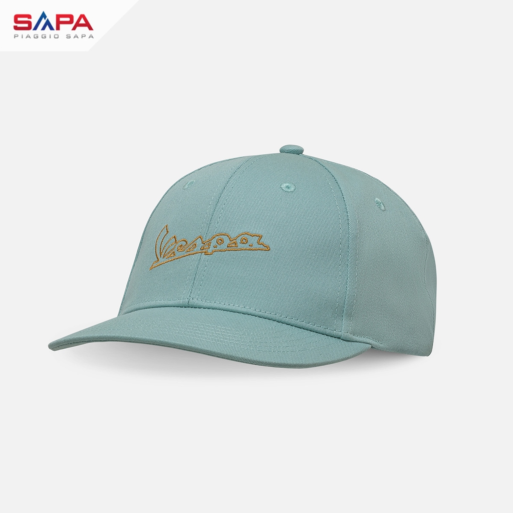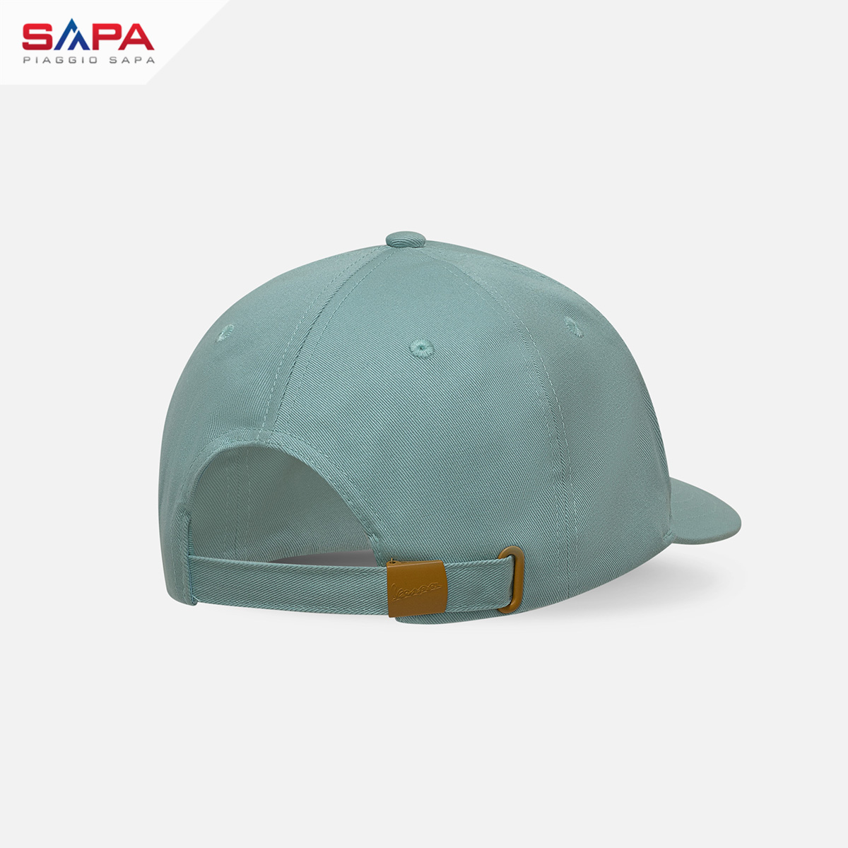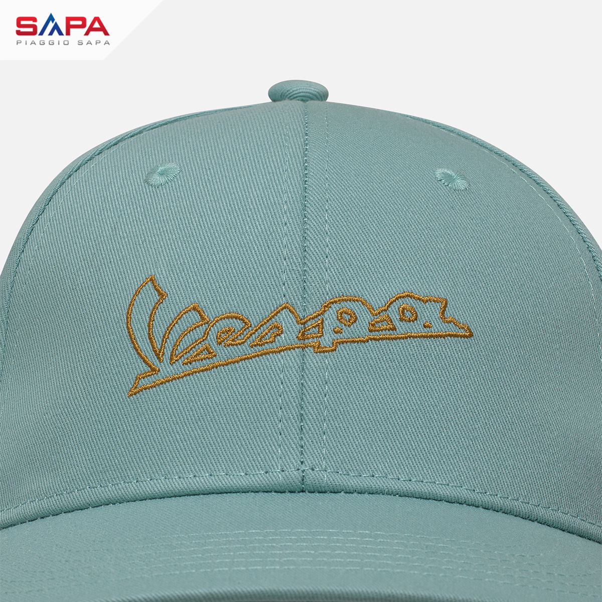 Chiếc mũ lưỡi trai cổ điển được "làm mới" theo phong cách Vespa với logo biểu tượng được thêu tinh xảo ở mặt trước. Đặc biệt, logo Vespa được thêu bằng chỉ màu cam nổi bật, tạo nên sự tương phản ấn tượng trên nền mũ màu xanh. Chốt điều chỉnh phía sau bằng kim loại còn được khắc logo Vespa, tạo nên sự kết hợp hài hòa giữa thể thao và sự thanh lịch, dễ dàng nhận diện thương hiệu.