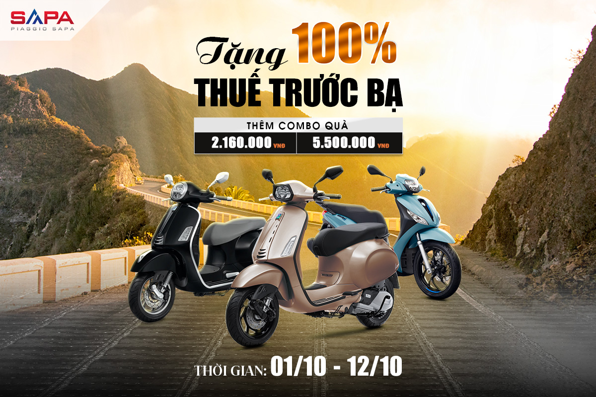 Một đặc quyền ưu đãi đang đón chờ bạn mua Vespa 2025 hoặc Piaggio 2025 mới nhất tại các hệ thống Showroom Vespa Sapa. TẶNG 100% THUẾ TRƯỚC BẠ khi mua xe Vespa/Piaggio 2025 cùng hàng loạt ưu đãi quà tặng cực lớn khác. Hãy đến ngay các hệ thống trung tâm ủy quyền chính hãng Vespa Sapa để được nhận ưu đãi đặc quyền.