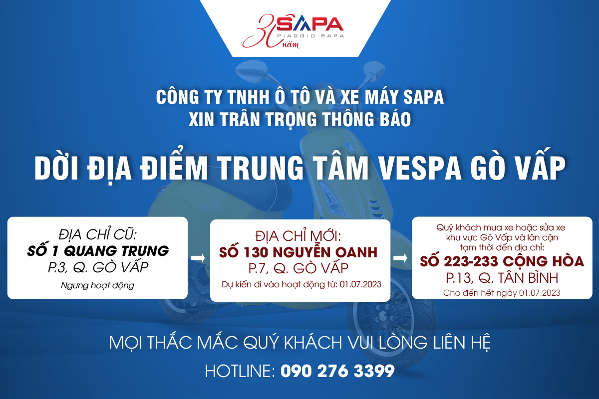 Kể từ ngày 01/06/2023 Trung tâm Vespa Sapa Gò Vấp tại địa chỉ Số 1 Quang Trung, Quận Gò Vấp sẽ tạm ngưng hoạt động và chuyển về địa chỉ mới: