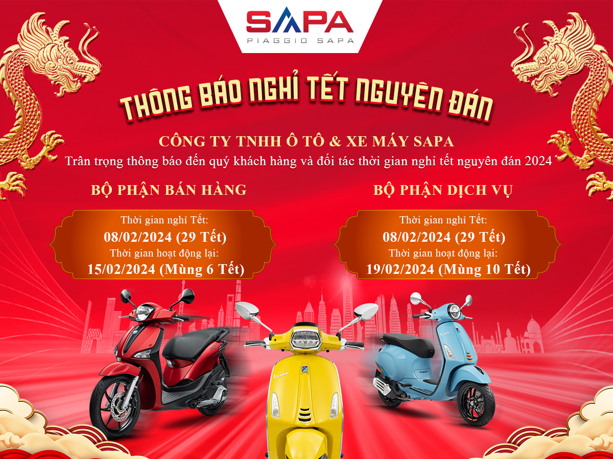 Nhân dịp năm mới Giáp thìn 2024, 𝐕𝐄𝐒𝐏𝐀 𝐒𝐀𝐏𝐀 kính chúc quý khách hàng năm mới an lành, vạn sự như ý. 𝐕𝐄𝐒𝐏𝐀 𝐒𝐀𝐏𝐀 thông báo đến quý khách hàng lịch nghĩ tết Nguyên đán 2024 trên toàn hệ thống cụ thể như sau:
