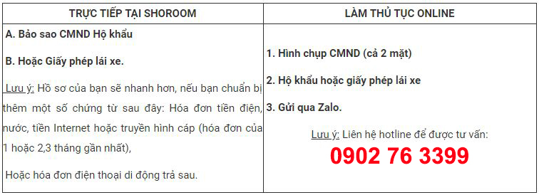 Bước 3: Nếu bạn ở Tp.HCM, đến Showroom làm thủ tục yêu cầu. Nếu bạn ở tỉnh, chụp hình hộ khẩu, CMND, hoặc bằng lái xe gửi cho nhân viên qua Zalo hoặc Viber, nhân viên sẽ hỗ trợ lên hồ sơ và gửi cho Công ty Tài Chính.