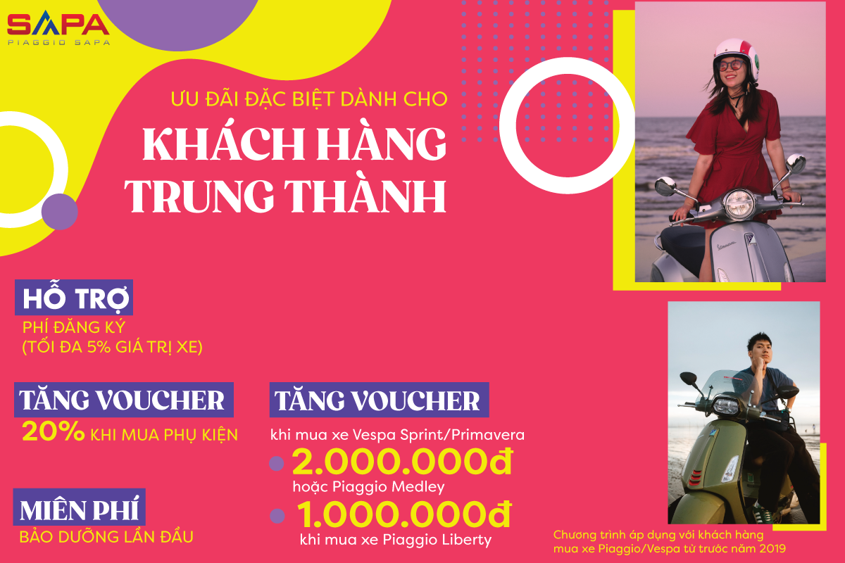 Trân trọng gửi đến quý khách hàng thân thiết đã đồng hành và tin tưởng trao trọn niềm tin với Vespa. Chúng tôi dành tặng một ưu đãi đặc biệt cho mọi khách hàng đã từng mua xe Vespa/Piaggio trước năm 2019 quay trở lại mua tiếp các dòng xe Vespa Sprint, Primavera, Liberty, Medley.
