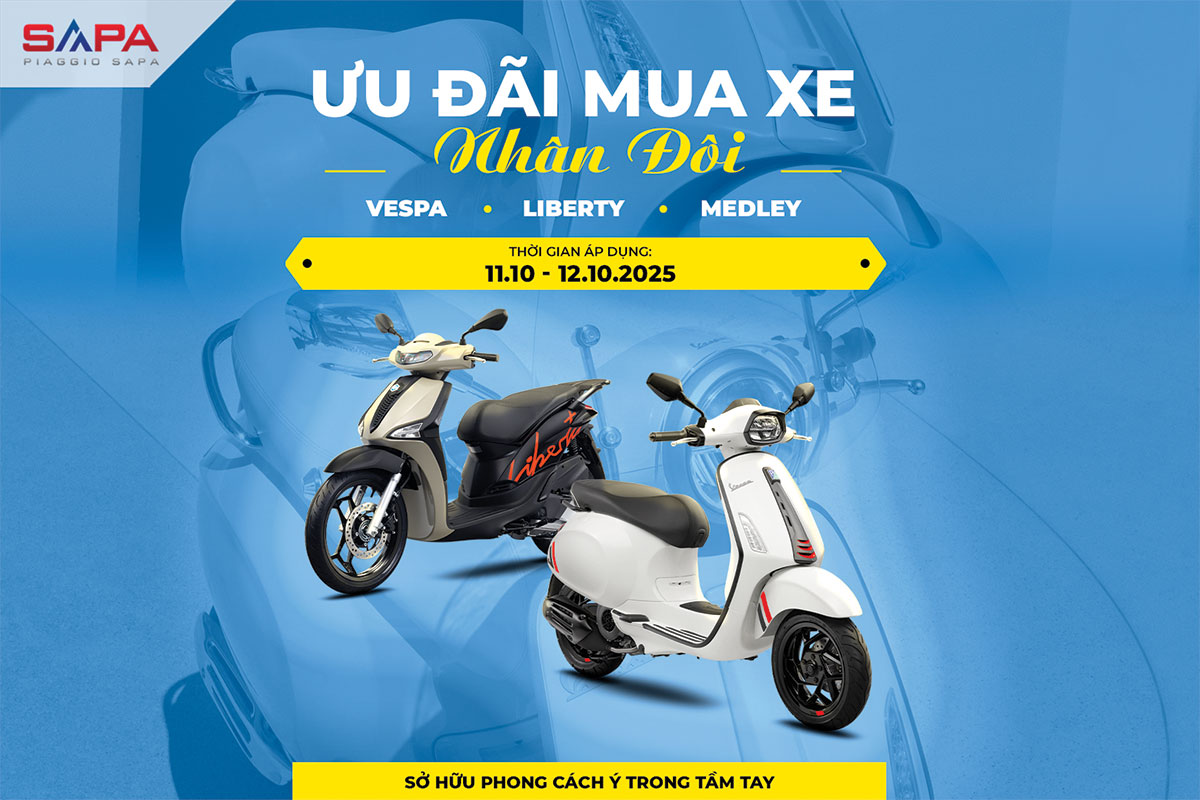 Duy nhất 2 ngày 11 và 12.10 với một đặc quyền ưu đãi cực lớn, đặc biệt là dành cho Vespa Spint (125/150cc) 2025 hoặc Piaggio Liberty 2025 tại các hệ thống Showroom Vespa Sapa. TẶNG 100% THUẾ TRƯỚC BẠ, cùng hàng Combo quà tặng trị giá 2tr940 và đặc biệt tặng THÊM BỘ MIA(Kết nối Smartphone) trị giá 3Tr200 cho xe Sprint/Primavera 2025 và bộ MIA trị giá 2tr800 cho xe Liberty 2025.
