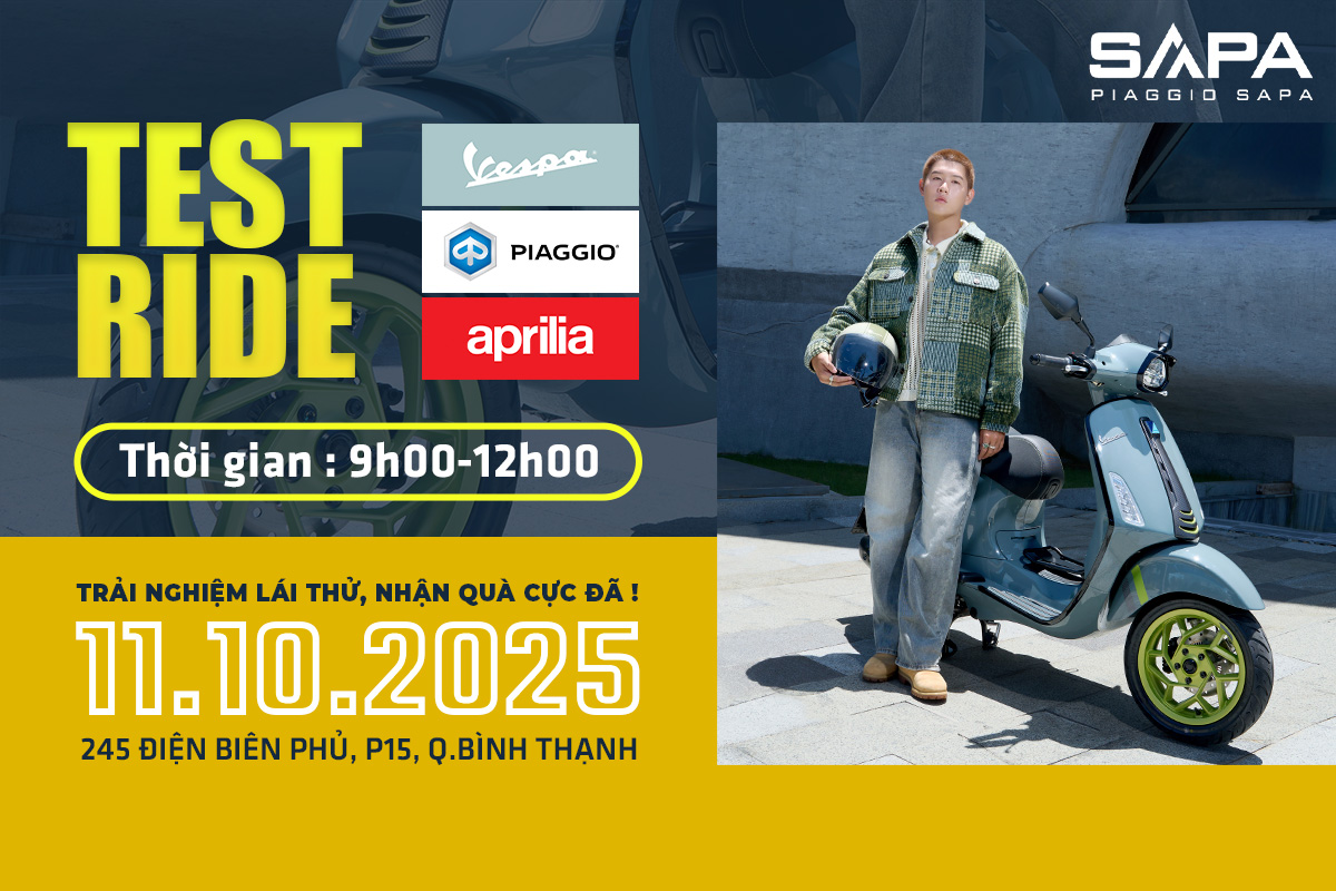 Trải nghiệm lái thử các dòng xe Vespa như: Sprint Tech 150, Liberty 2025, Piaggio Medley 150, Aprilia SRGT200 duy nhất ngày 11.10.2025 tại trung tâm Vespa Sapa Điện Biên Phủ. Ngoài cơ hội trải nghiệm các phiên bản mới và khám phá các phiên bản vừa ra mắt Vespa Sprint Tech màu Nâu đồng, GTV300 Officina8, Sprint Officina8 Quý khách hàng nhận những ưu đãi cực lớn khi mua xe, hãy đăng ký ngay và đến tham gia sự kiện tại: