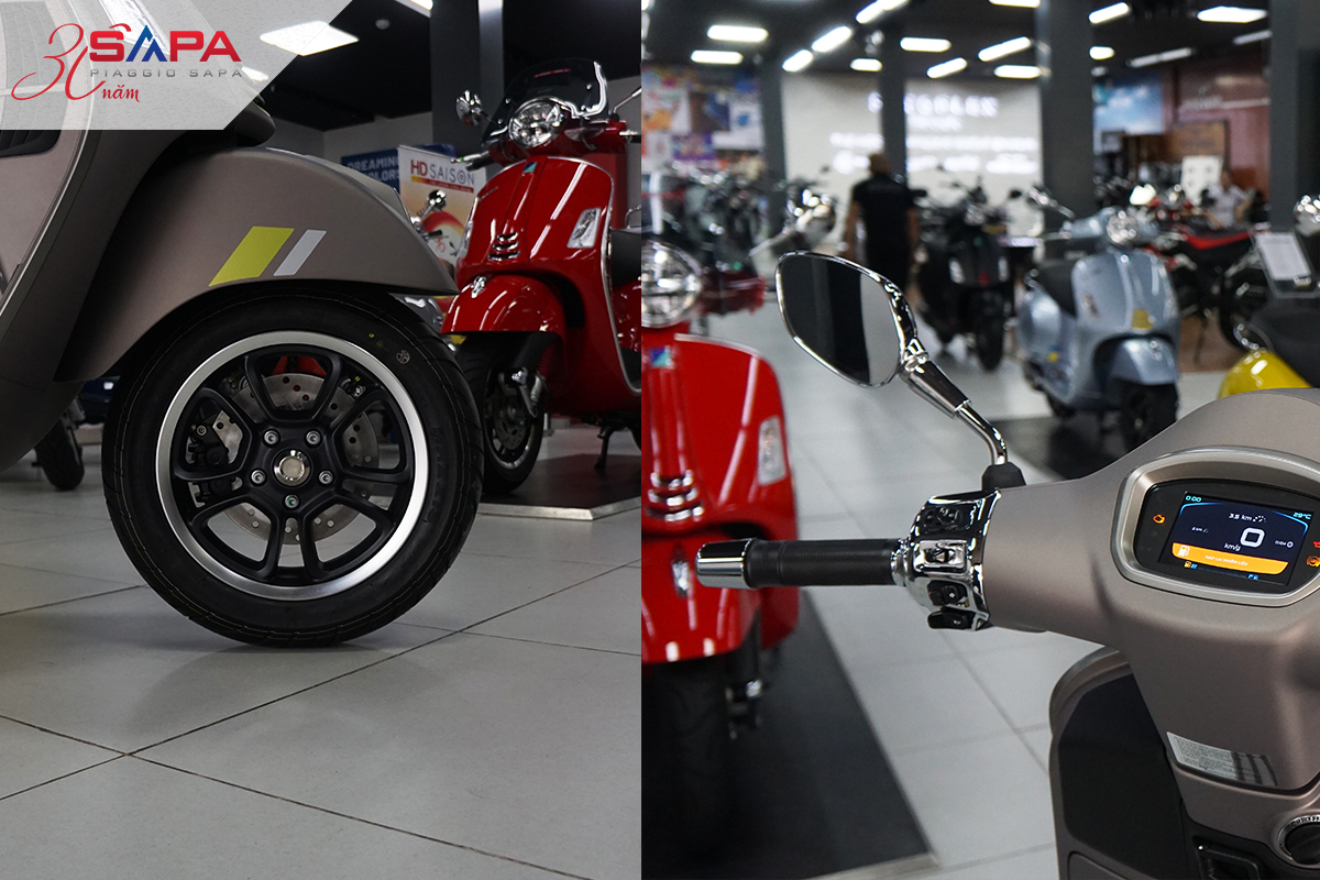 Mâm xe Vespa GTS 300HPE 2023 được tinh chỉnh, hình dạng 5 cánh hoa trông bắt mắt và đầy đặn hơn so với trước đó. Đây cũng là khác biệt về mặt ngoại hình của GTS Super tech 300HPE 2023. Kính chiếu hậu của GTS không còn sử dụng loại tròn mà thay thế bằng kiểu thuôn dài.