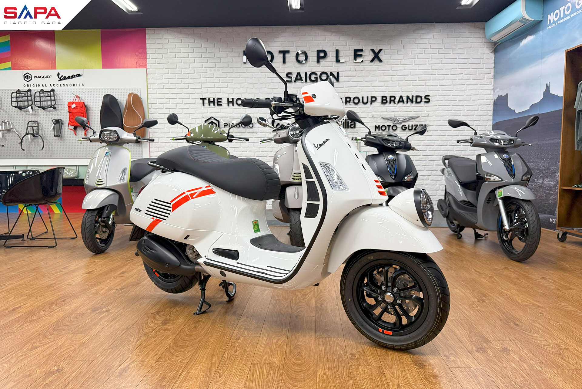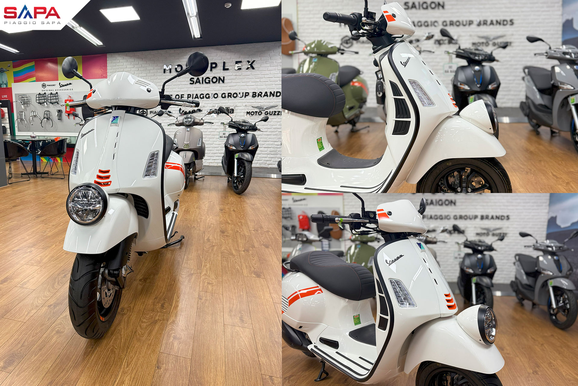 Điểm nổi bật nhất ở phiên bản này chính là lớp sơn Trắng nhám (Bianco Opaco) – một gam màu hiếm thấy ở các dòng xe đậm chất retro như Vespa GTV. Sự kết hợp giữa nền trắng tinh tế và các chi tiết đen nhám mạnh mẽ như viền chắn bùn, tay lái, yên xe và mâm bánh mang lại vẻ ngoài vừa lịch lãm, vừa đậm chất thể thao.