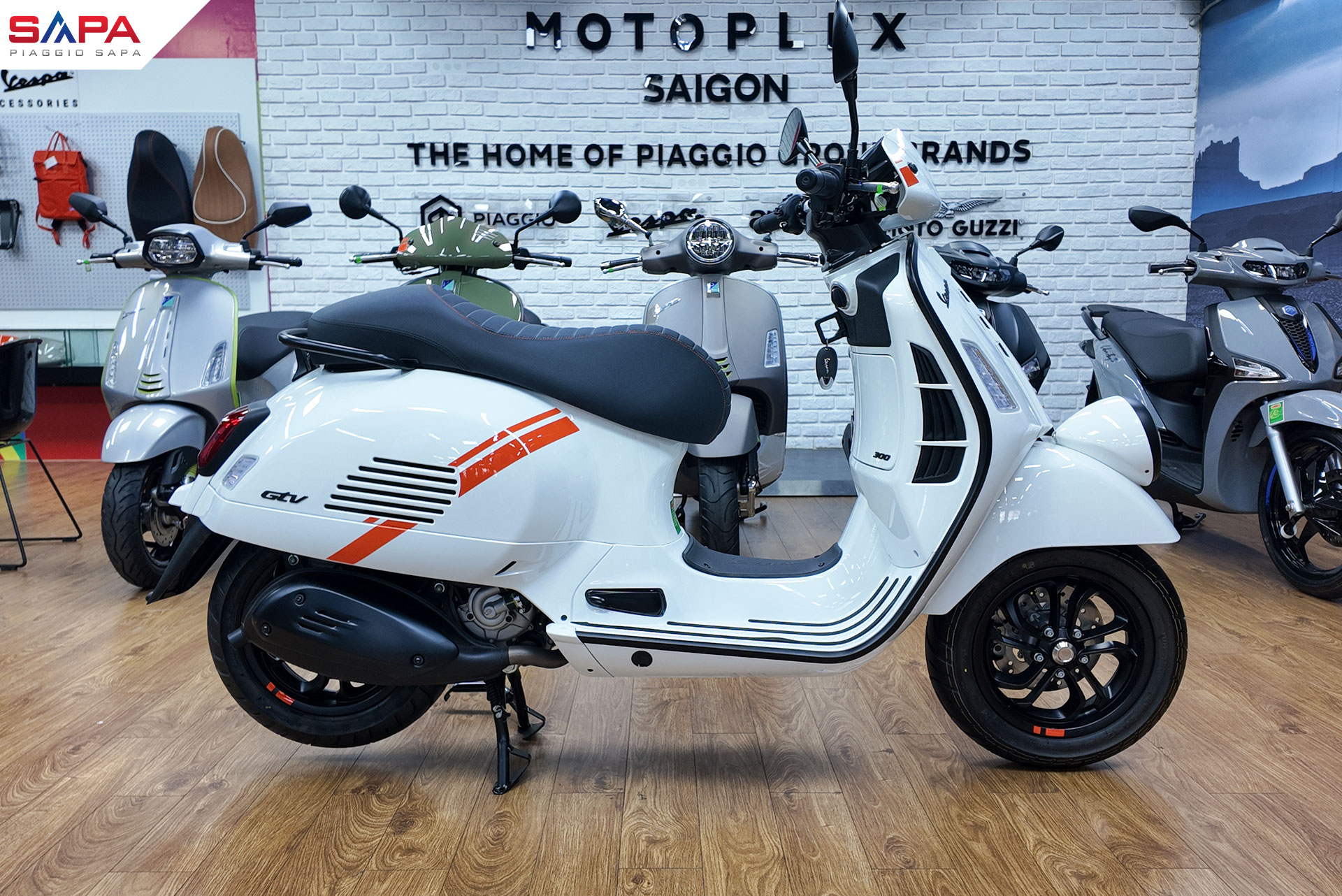 Phiên bản màu trắng của Vespa GTV Sei Giorni 300 HPE không chỉ hiếm và khác biệt, mà còn mang lại cảm giác cao cấp hơn, tinh tế hơn – nhưng vẫn đậm chất đường đua nhờ vào thiết kế đặc trưng và động cơ mạnh mẽ.