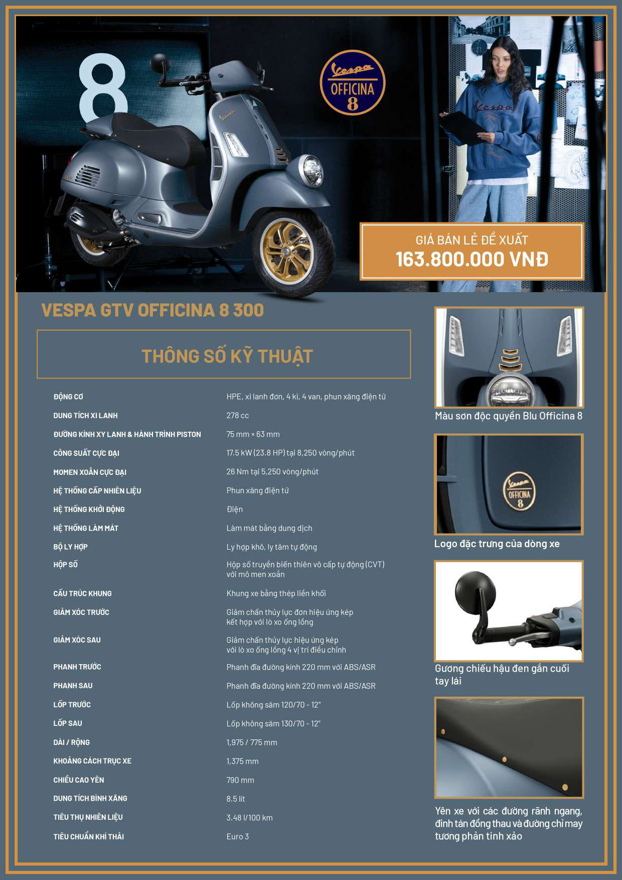 Vespa GTV300 Officina8 là phiên bản đặc biệt và giới hạn sản xuất (với số lượng cực kỳ hạn chế), kết hợp di sản Vespa đã hơn 79 năm với phong cách công nghiệp hiện đại, nổi bật với màu sơn xanh đậm, ghi-đông trần, đèn pha thấp và yên đơn thể thao màu nâu.