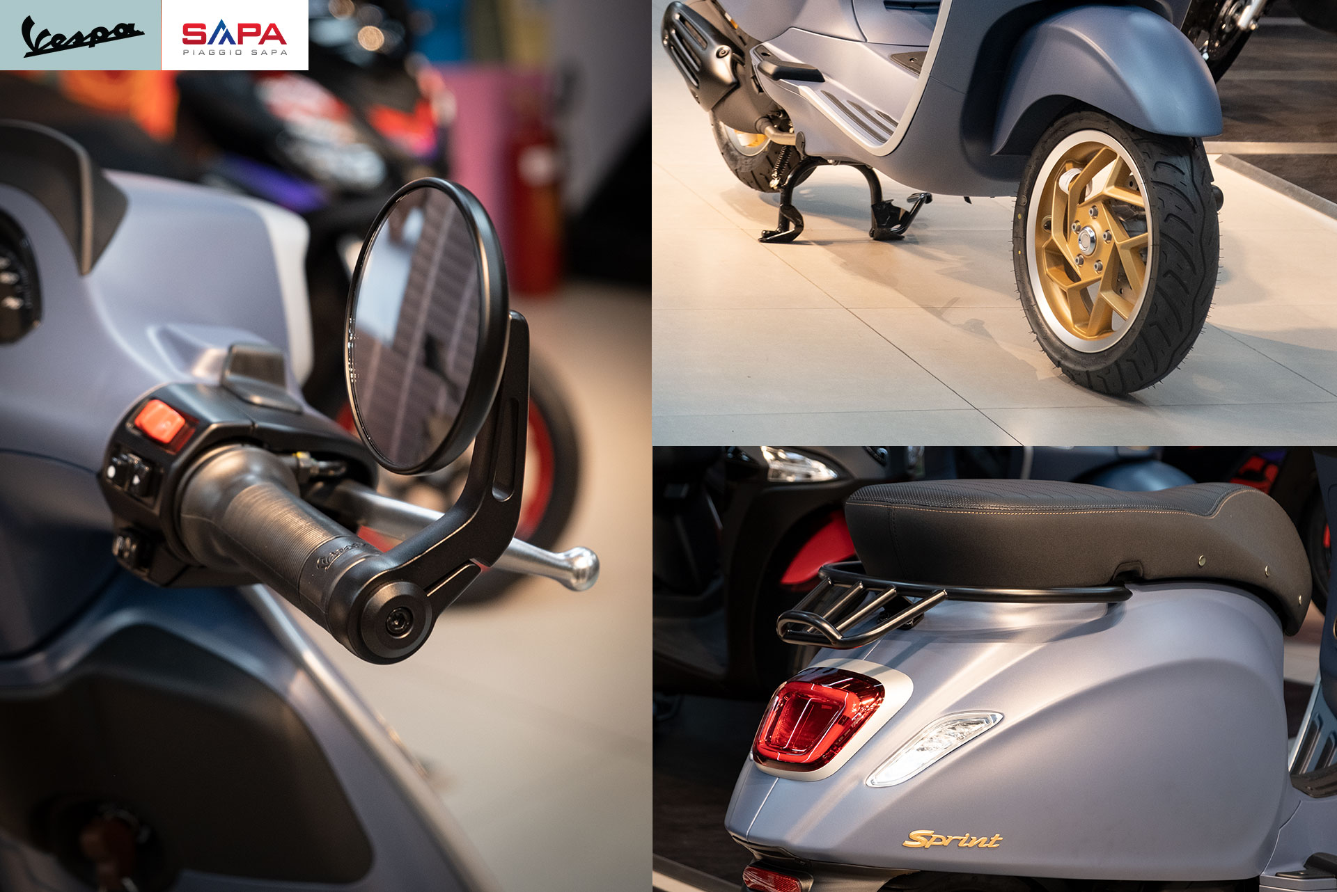 Điểm nhấn làm nên sự khác biệt của phiên bản này là các chi tiết kim loại màu vàng đồng thau sang trọng và bắt mắt. Từ logo "Vespa Officina 8" nổi bật trên xe, tên "Sprint" và con số "125", tất cả đều được tạo hình tinh xảo, thể hiện giá trị độc bản.